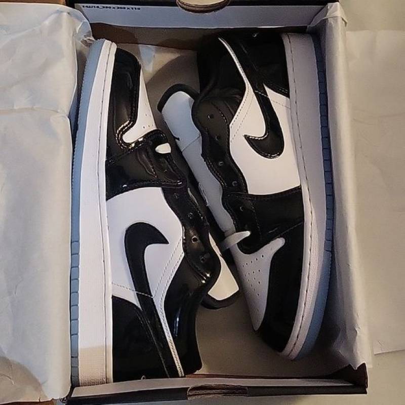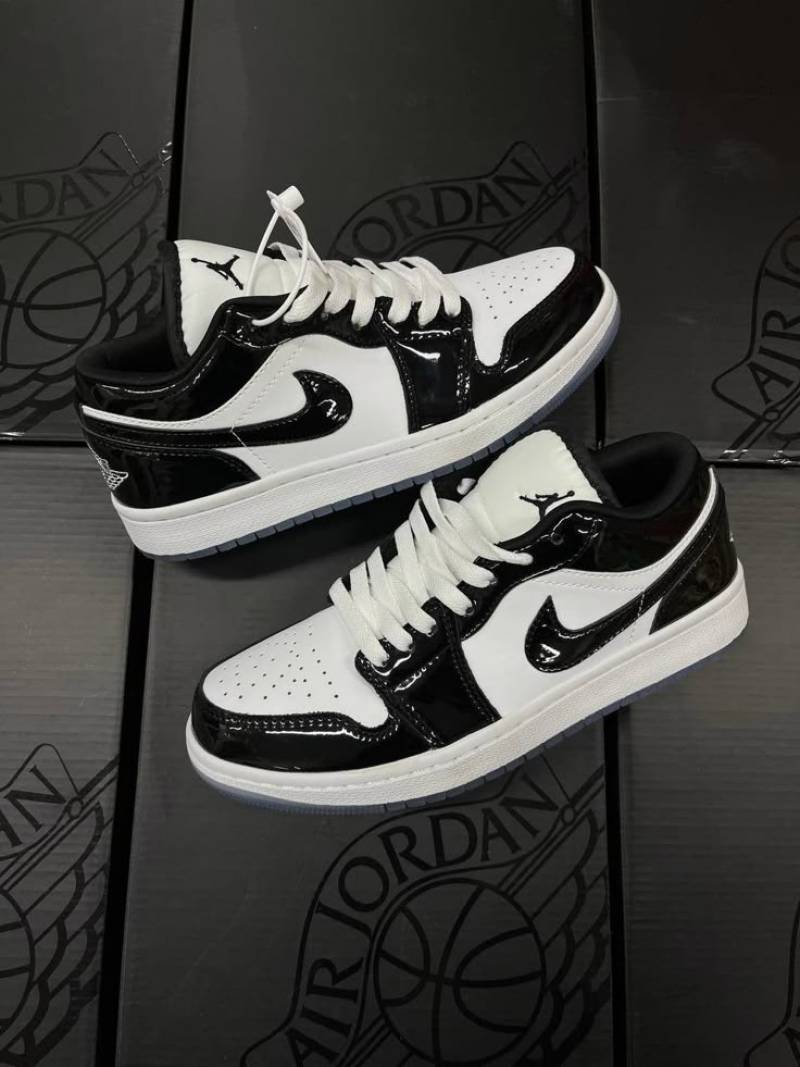 The Air Jordan 1 Low SE 'Concord' borrows colors and materials from an iconic OG colorway of the Air Jordan 11. The white leather upper is contrasted by black patent leather on the forefoot and heel overlay, as well as the signature Swoosh. A Jumpman icon decorates the tongue, while a stitched Wings logo graces the back heel. Inside each shoe, the sockliners are marked with Jumpman' and 'Jordan' in Dark Concord lettering, featuring the same typeface used on the AJ11 tongue branding. A translucent rubber outsole provides durable traction underfoot