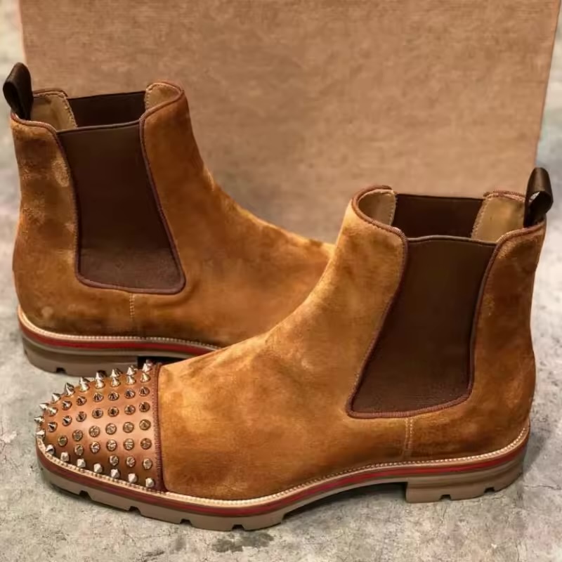 These are Christian Louboutinn Men's Melon Spikes Chelsea Boots in a tan suede finish featuring signature gold metal spikes on the toe and a red rubber lug sole.?
