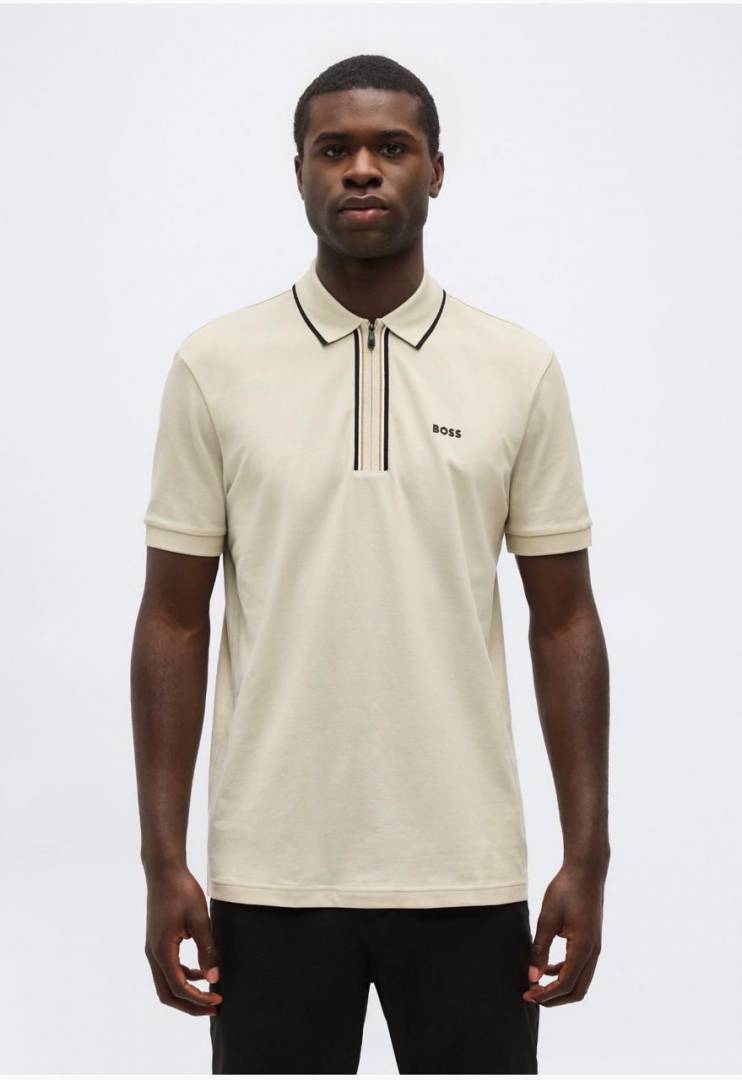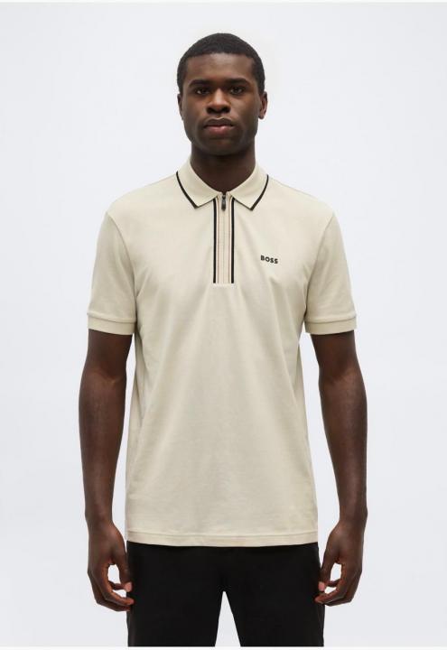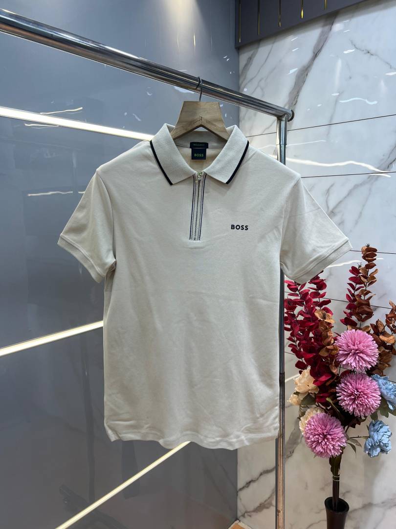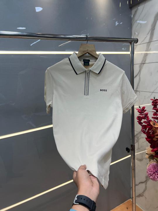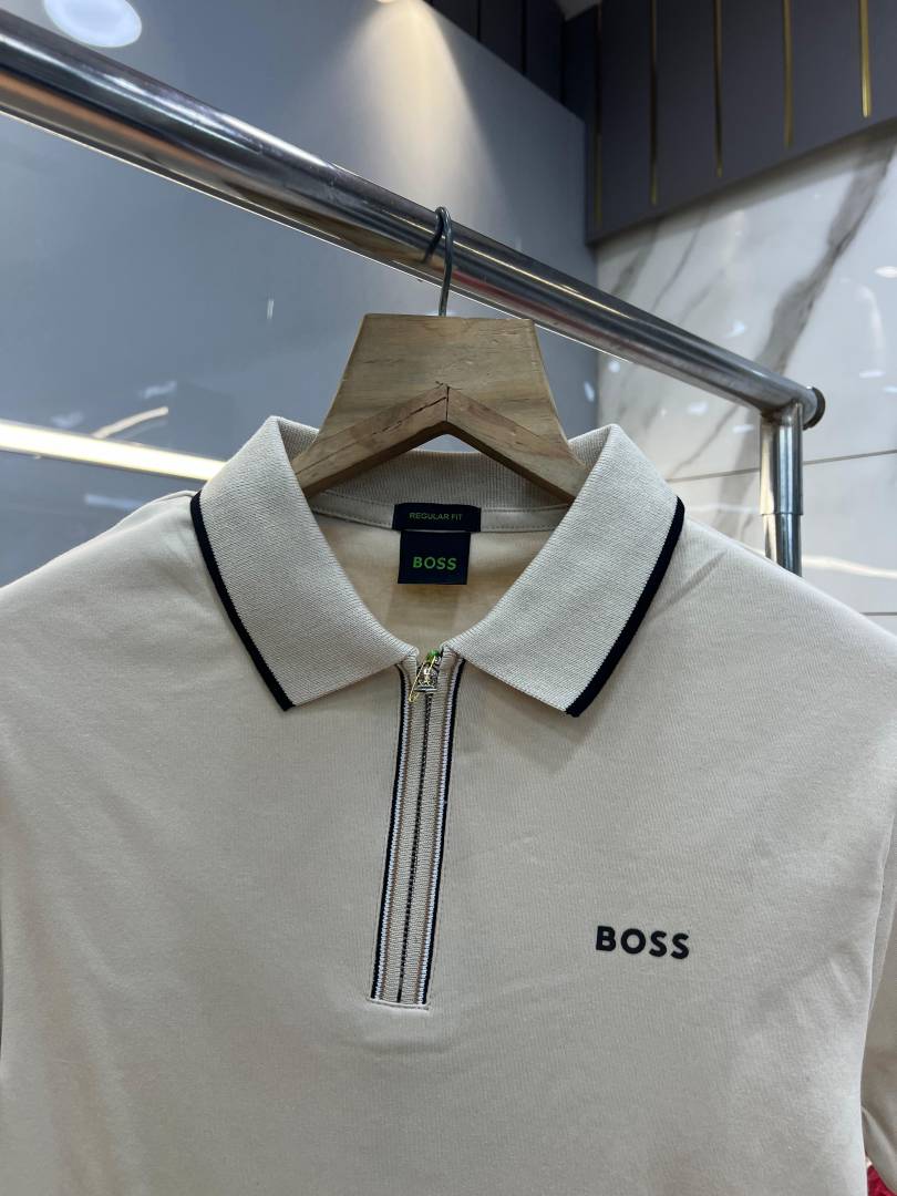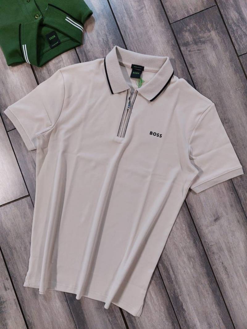 Hugo Bos s Cream Premium Imported 240 GSM Interlock Lycra Fabric Polo Tshirt with Collar Design and Emboss Logo Zip Style 4076