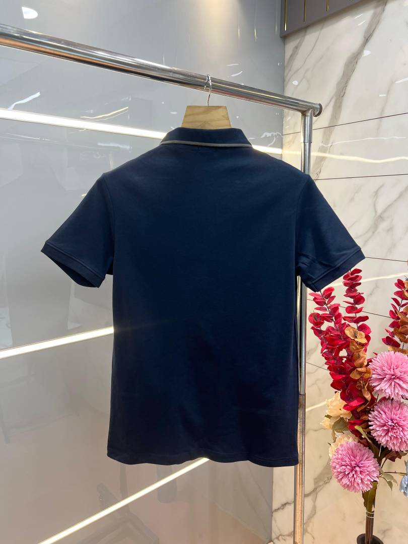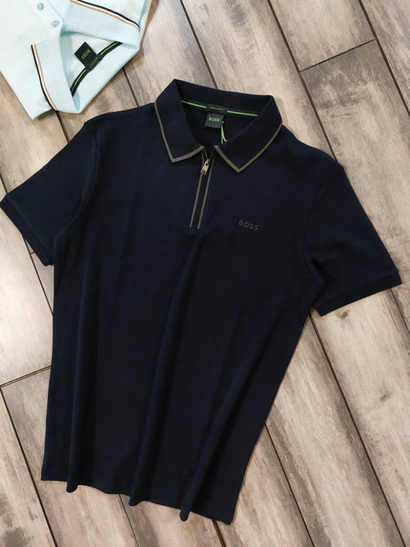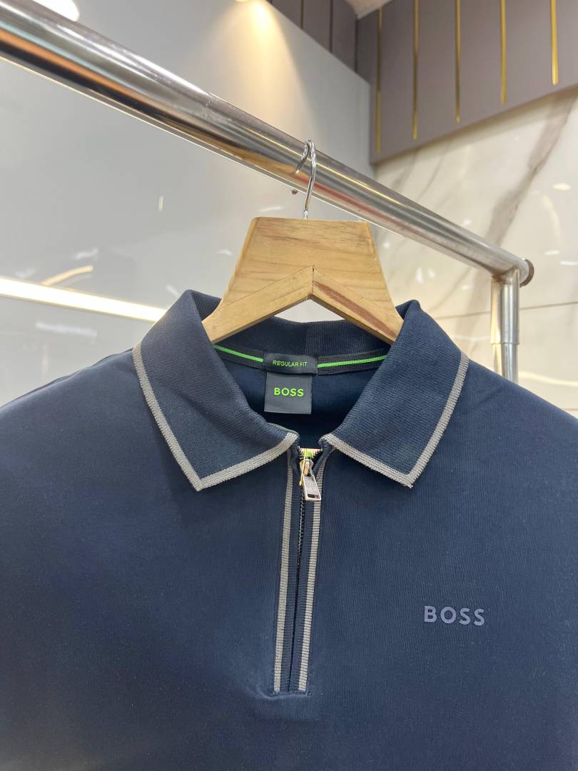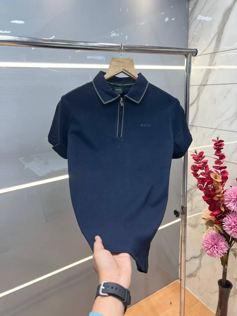 Hugo Bos s Navy Premium Imported 240 GSM Interlock Lycra Fabric Polo Tshirt with Collar Design and Emboss Logo Zip Style 4075