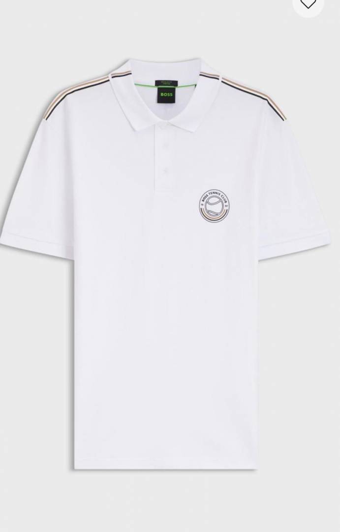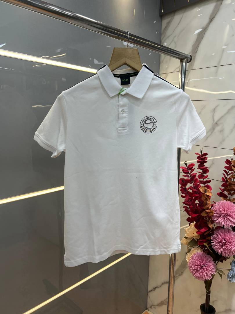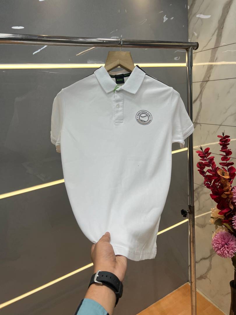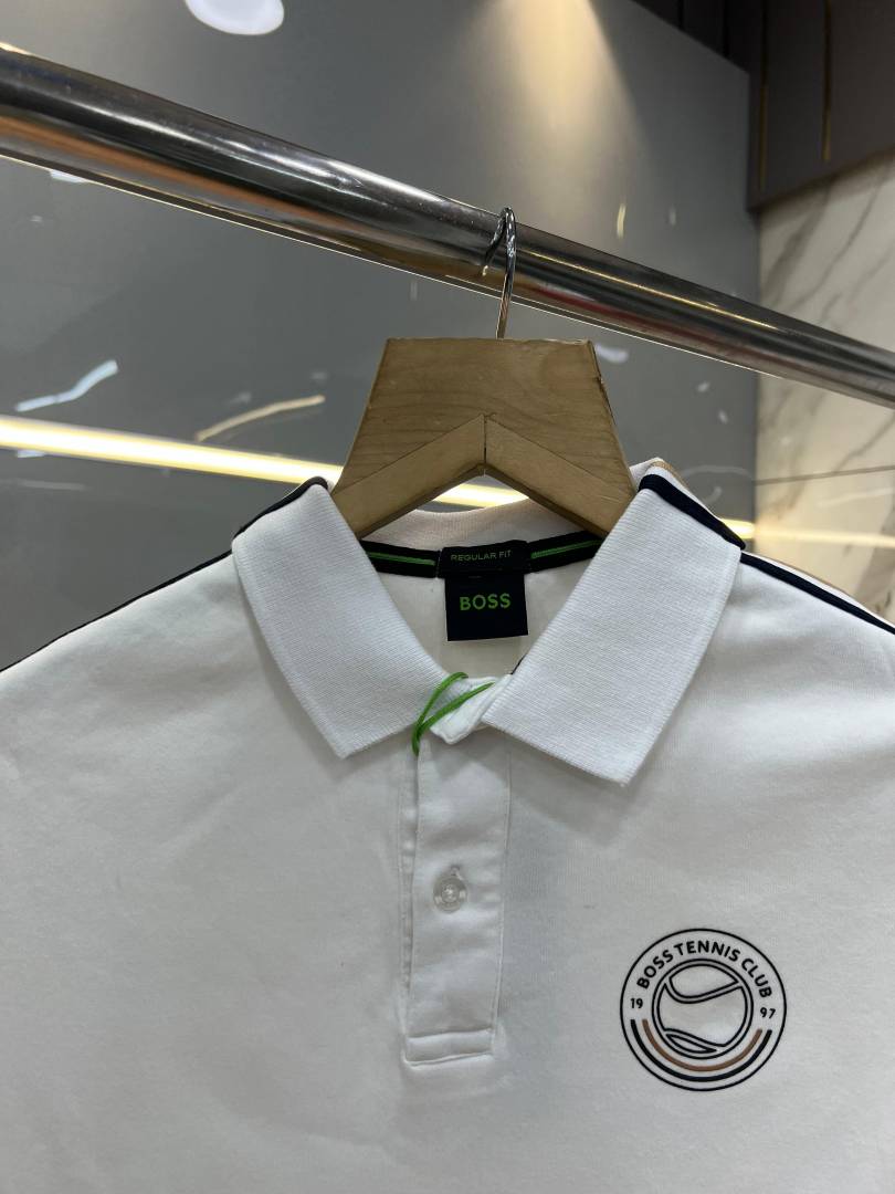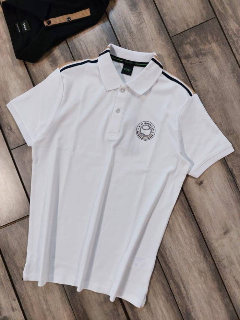 Hugo Bos s White Premium Imported 240 GSM Interlock Lycra Fabric Polo Tshirt with Shoulder Design and Emboss Logo 4078